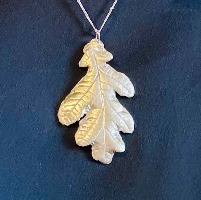 This piece is made from a real Oak leaf which is painted with many layers of silver metal clay. Once dry the piece is fired, destroying the leaf, making each pendant completely unique.